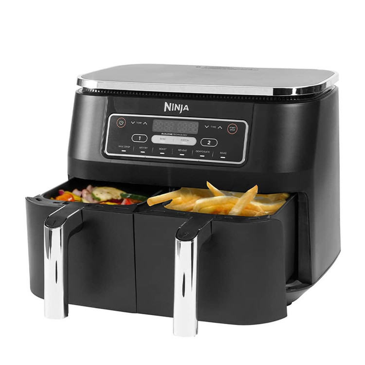 ۲ منطقه پخت مستقل: ۲ غذا، ۲ روش، هر دو آماده به طور همزمان بپزید. از عملکردها، زمانها و دماهای مختلف در هر کشو استفاده کنید تا وعدههای غذایی کاملی را در یک دستگاه ایجاد کنید یا ۲ سلیقه را برآورده کنید. ۶ عملکرد پخت: حداکثر تردی، سرخ کردن در هوا، کباب کردن، پختن، گرم کردن مجدد، آبگیری. از حالت یخزده تا ترد بپزید. تا ۷۵٪ چربی کمتر* با استفاده از عملکرد سرخ کردن در هوا (*آزمایش شده در برابر سیبزمینی سرخکرده سرخشده و برشخورده با دست).
