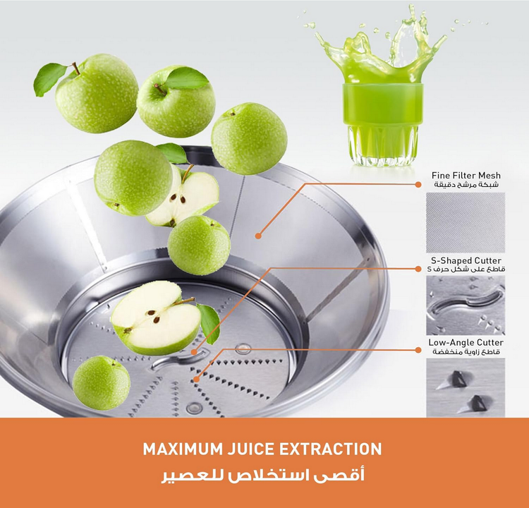 چرخ تمام فلزی منحصر به فرد پاناسونیک به طور موثر حداکثر آبمیوه را استخراج میکند و در نتیجه آبمیوه نرم و بدون تفاله به دست میآید که نوشیدن آن حتی برای کودکان نیز آسان است. برش S شکل چرخ تمام فلزی به طور محکم از مرکز سخت میوه برش میدهد و برش زاویه کم آن را به طور کامل استخراج میکند. توری فیلتر ریز، آبمیوه را از تفاله جدا میکند تا همیشه یک نوشیدنی با بافت نرم داشته باشید.