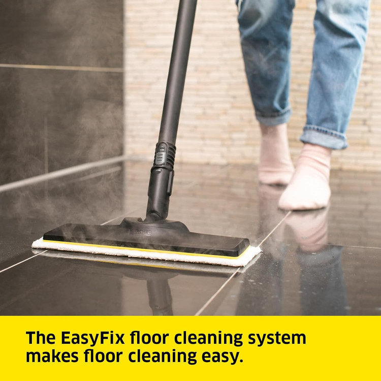 ست تمیزکننده کف EasyFix با اتصال انعطافپذیر روی نازل کف و اتصال راحت پارچه تمیزکننده کف با قلاب و حلقه. نتایج بهینه تمیز کردن روی انواع کفهای سخت در اطراف خانه به لطف فناوری کارآمد لاملا. تعویض پارچه بدون تماس و بدون تماس با آلودگی و اتصال راحت پارچه تمیزکننده کف به لطف سیستم قلاب و حلقه. تمیز کردن ارگونومیک و موثر با تماس کامل با کف، صرف نظر از قد کاربر، به لطف اتصال انعطافپذیر نازل.
